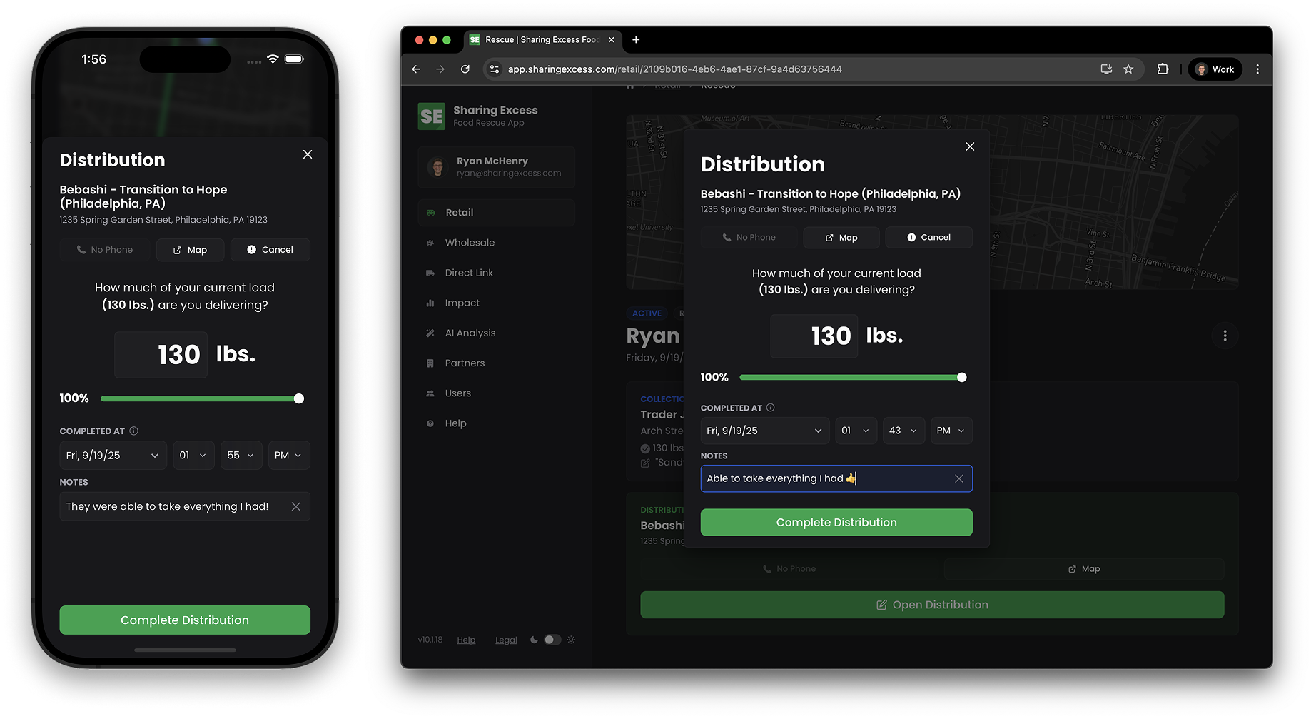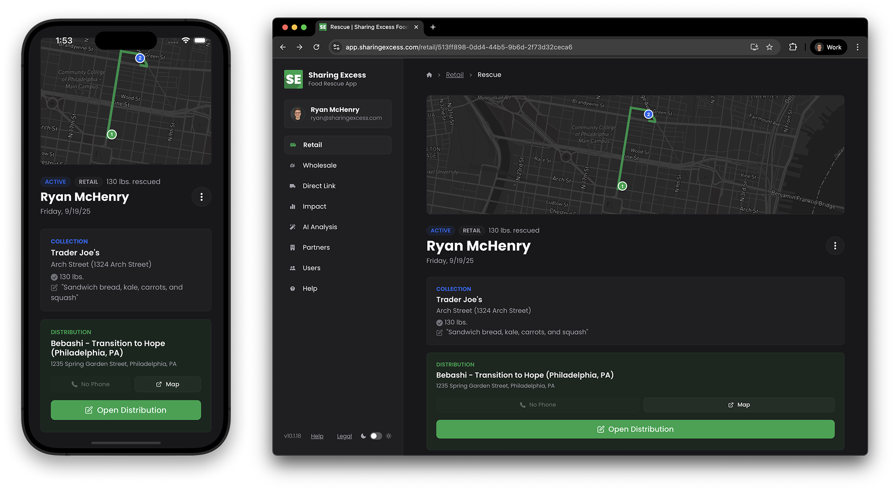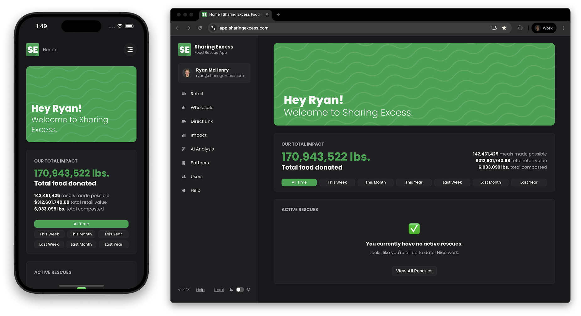 - Impact metrics show your contribution (pounds rescued, meals provided)